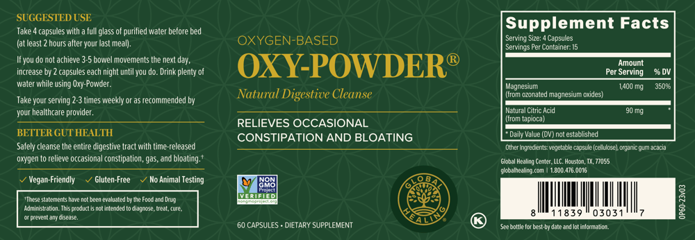 Oxy-Powder: Take 4 capsules with a full glass of purified water before bed. If you do not achieve 3-5 bowel movements the next day, increase by 2 capsules each night until you achieve 3-5 movements. Take your serving 2-3 times weekly or as desired. Drink plenty of water while using Oxy-Powder. Tip: Adding fresh lemon juice to your water will increase the effectiveness of Oxy-Powder.